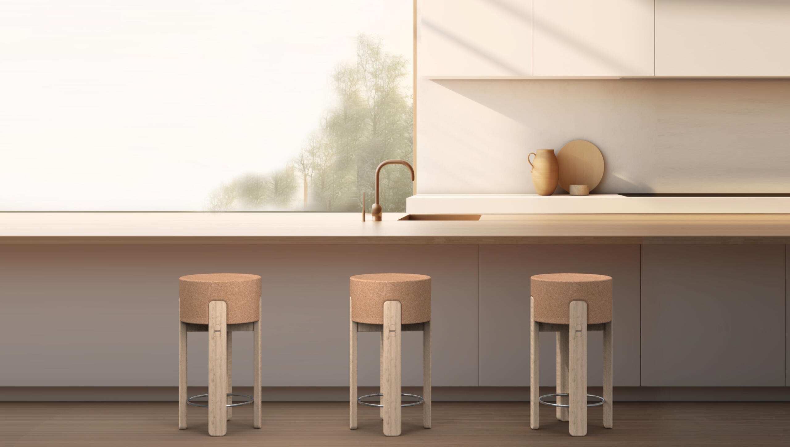 Esta linha de bancos e coffe table, é de um design simples e utiliza materiais sustentáveis na sua maior expressão como a madeira e em especial a cortiça.